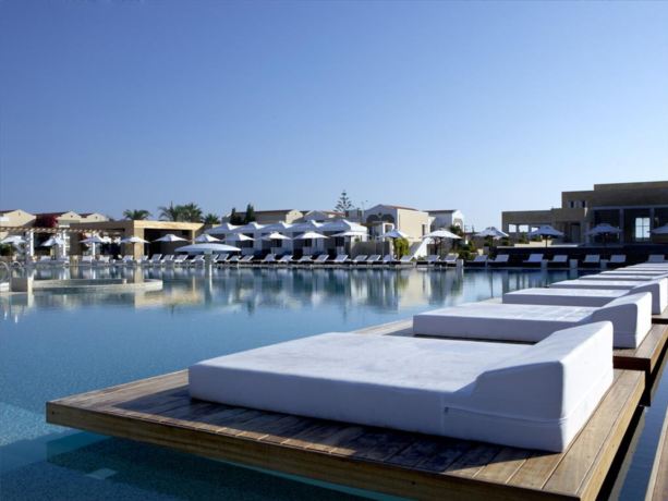 Deluxe sea view bungalows are built amidst wonderful gardens overlooking the Aegean Sea, featuring a very modern white design. They measure approximately 33 m2 (renovated 2016) interior area and offer a large exterior patio. Min. occupancy: 2 adults / Max. occupancy 2 adults or 2 adults + 1 baby cot